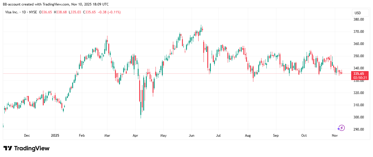 In de onderstaande grafiek zien we het koersverloop van Visa: