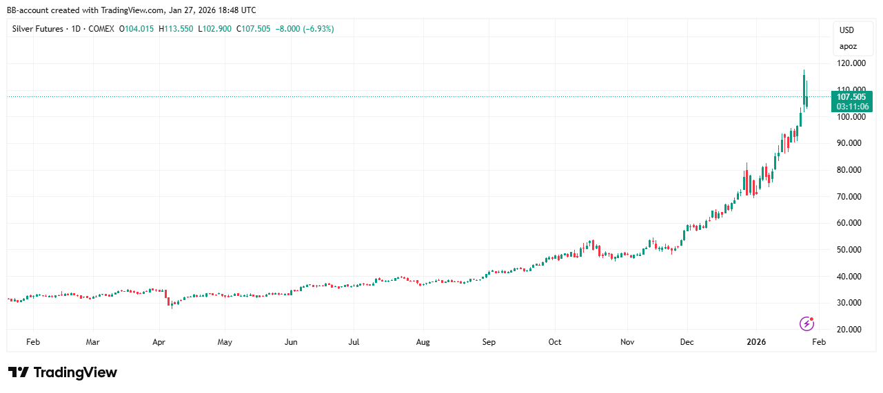 De zilverprijs steeg maandag tot $117 per troy ounce en overtrof daarmee de winst van bitcoin sinds 2017. Aan zilver gekoppelde ETF’s, zoals de iShares Silver Trust, noteerden ongekende handelsvolumes van $32 miljard. De rally wordt aangedreven door sterke vraag, zwakke dollar en industriële consumptie, terwijl bitcoin achterblijft.