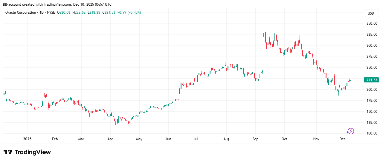 Oracle’s aandelen hebben de volledige winst sinds de 36% koerssprong in september verloren. Tegelijk staan de vijfjarige credit default swaps op recordhoogte door zware leningen voor datacenterbouw.